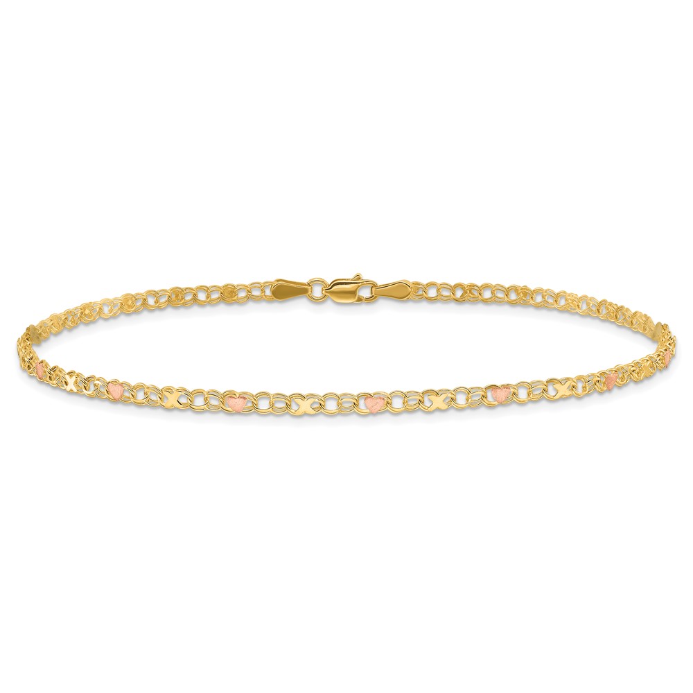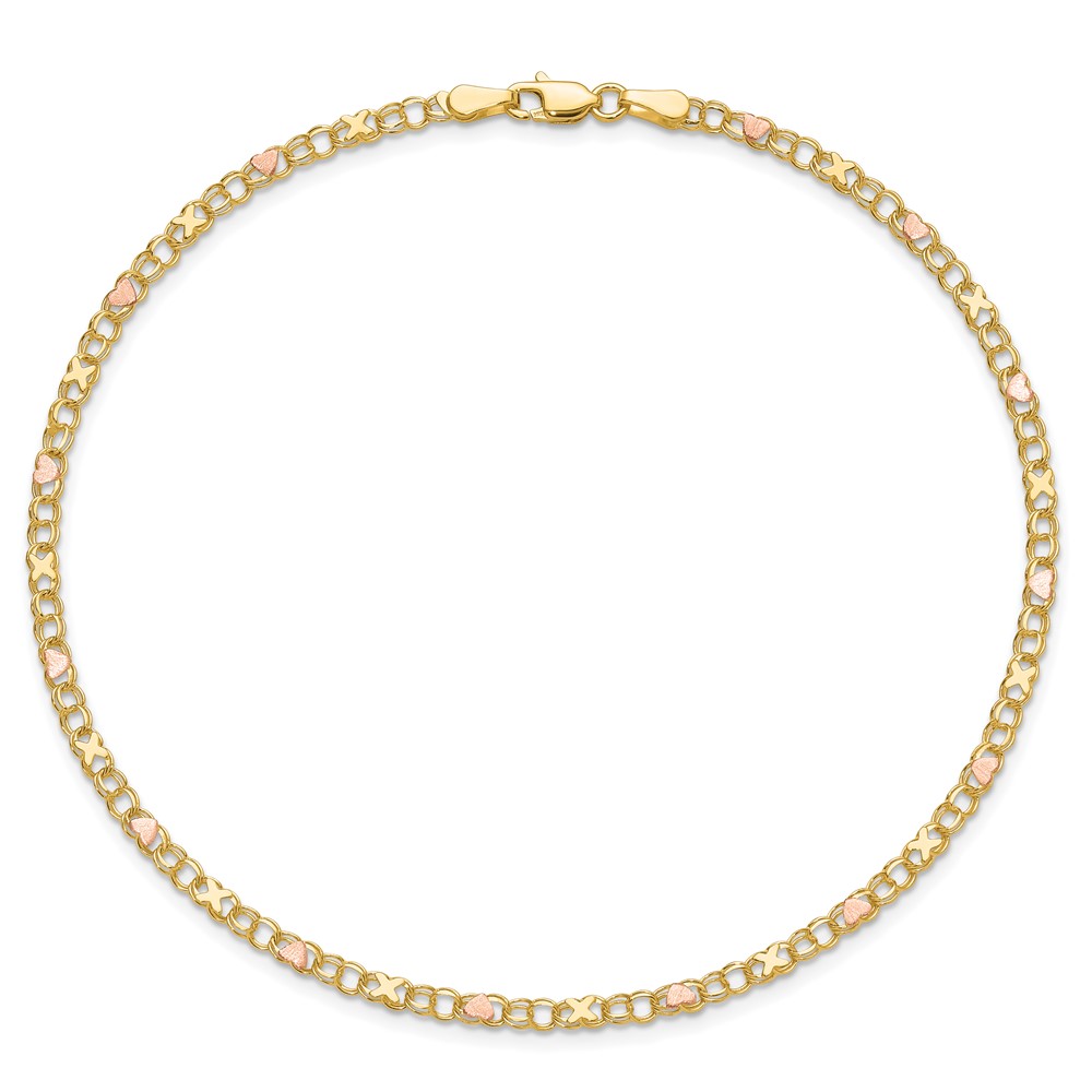10k and Rose Rhodium Polished and Satin X-and-Heart Anklet