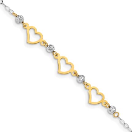 14K Two-tone Puffed LOVE Heart and Diamond-cut Beads Bracelet Plus Heart Dangle Extender