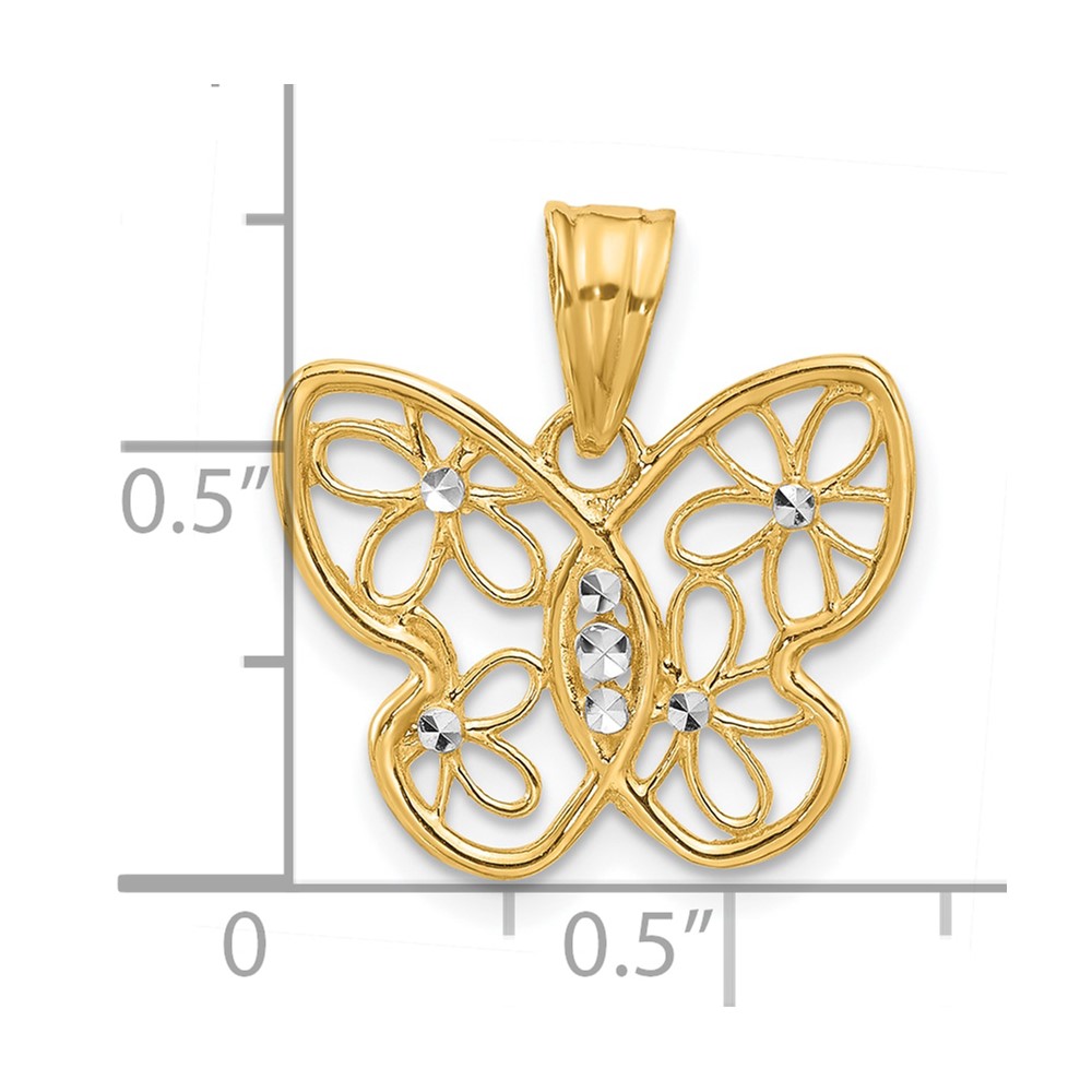 14K and White Rhodium Polished and Diamond-cut Flower Butterfly Pendant