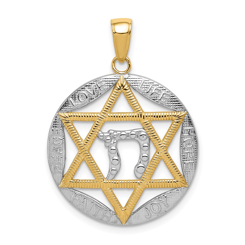 14K and White Rhodium Star of David with Chai LOVE LIFE HOPE JOY FAITH PEACE Round Pendant