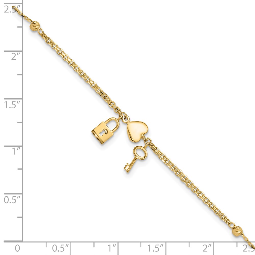 14K Polished and Diamond-cut Heart Lock and Key 7 inch Bracelet Plus 0.5 inch Extender