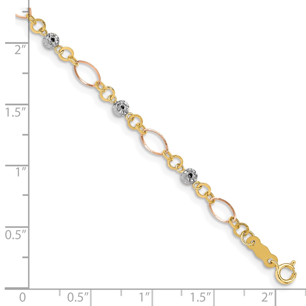 14k Tri-color Polished Diamond-cut Ovals and Donut Beads 7.5 inch Bracelet