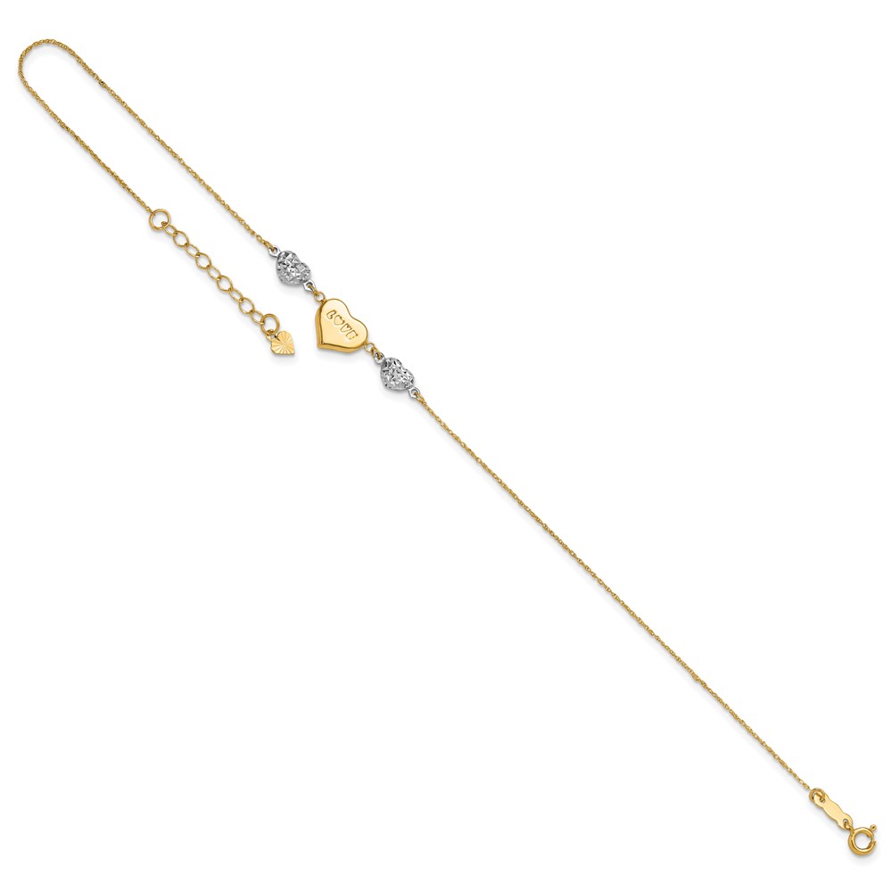 14K Two-tone Diamond-cut and MOM Puffed Heart Plus Extender - Total Anklet