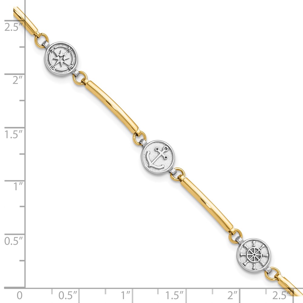 14K Two-tone Polished Compass/Anchor/Ships Wheel 7 inch Bracelet Plus 1 inch Extender
