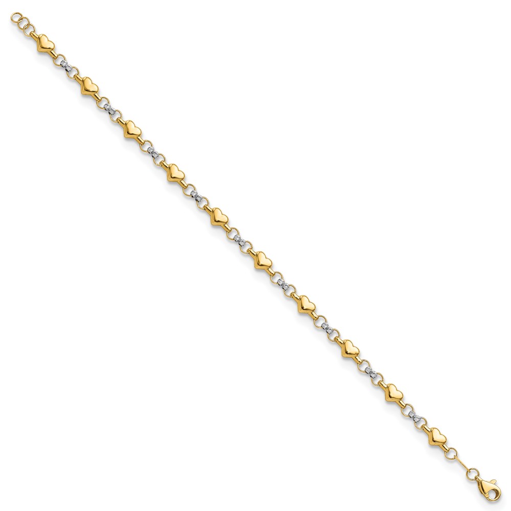 14K Two-tone Diamond-cut Hearts and Beads 7 inch Bracelet