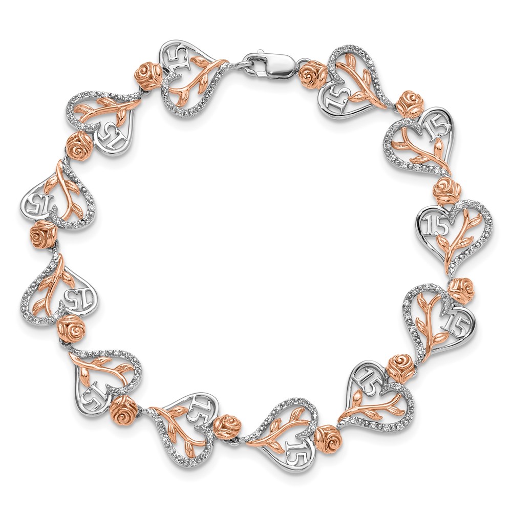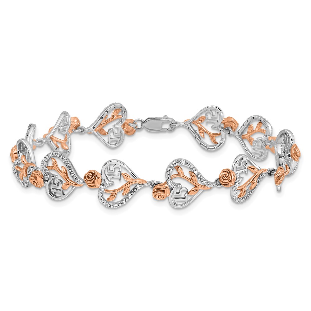 14K White and Rose Gold Complete 1/3 carat Diamond 15 and Rose Quinceanera Heart 7 inch Bracelet
