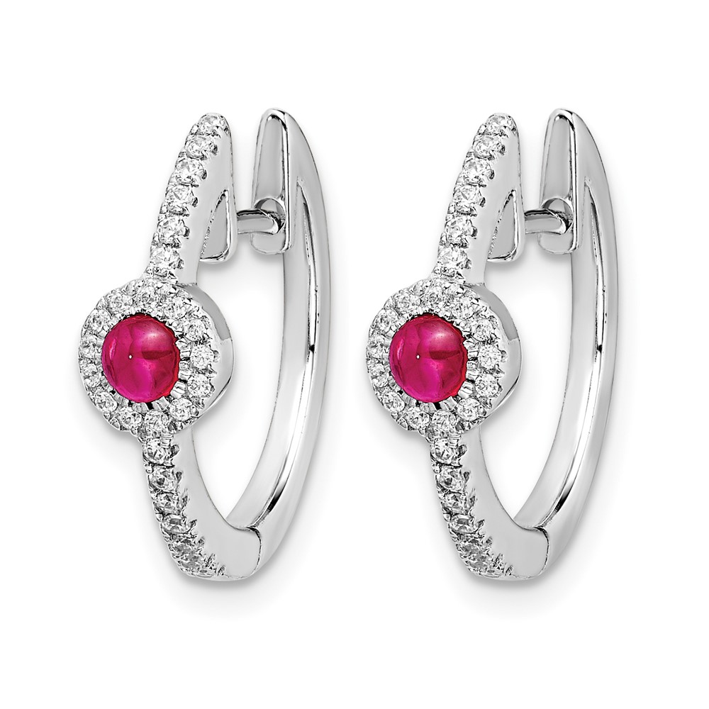 14k White Gold 2.7mm Round Ruby Cabochon and Diamond Hinged Hoop Earrings
