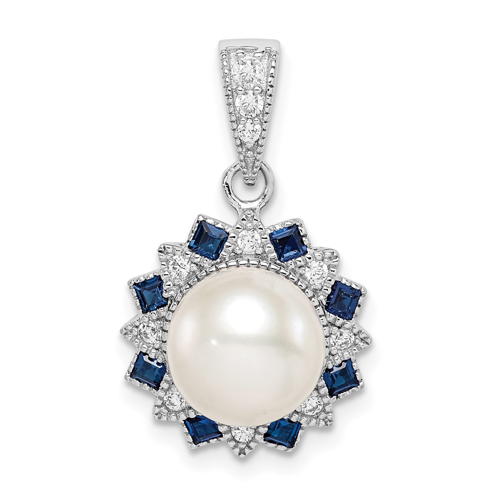 Sterling Silver RH-plated FWC Pearl/Syn. Blue Spinel Flower Pendant