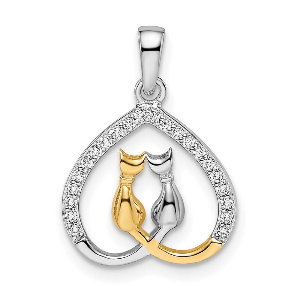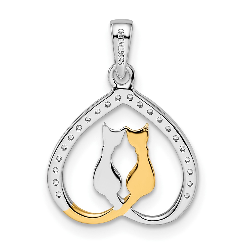 Sterling Silver RH-plated & Gold-plated CZ Heart w/Two Cats Pendant