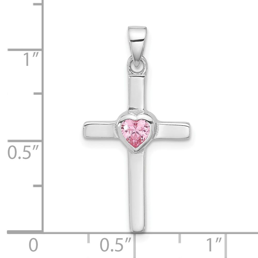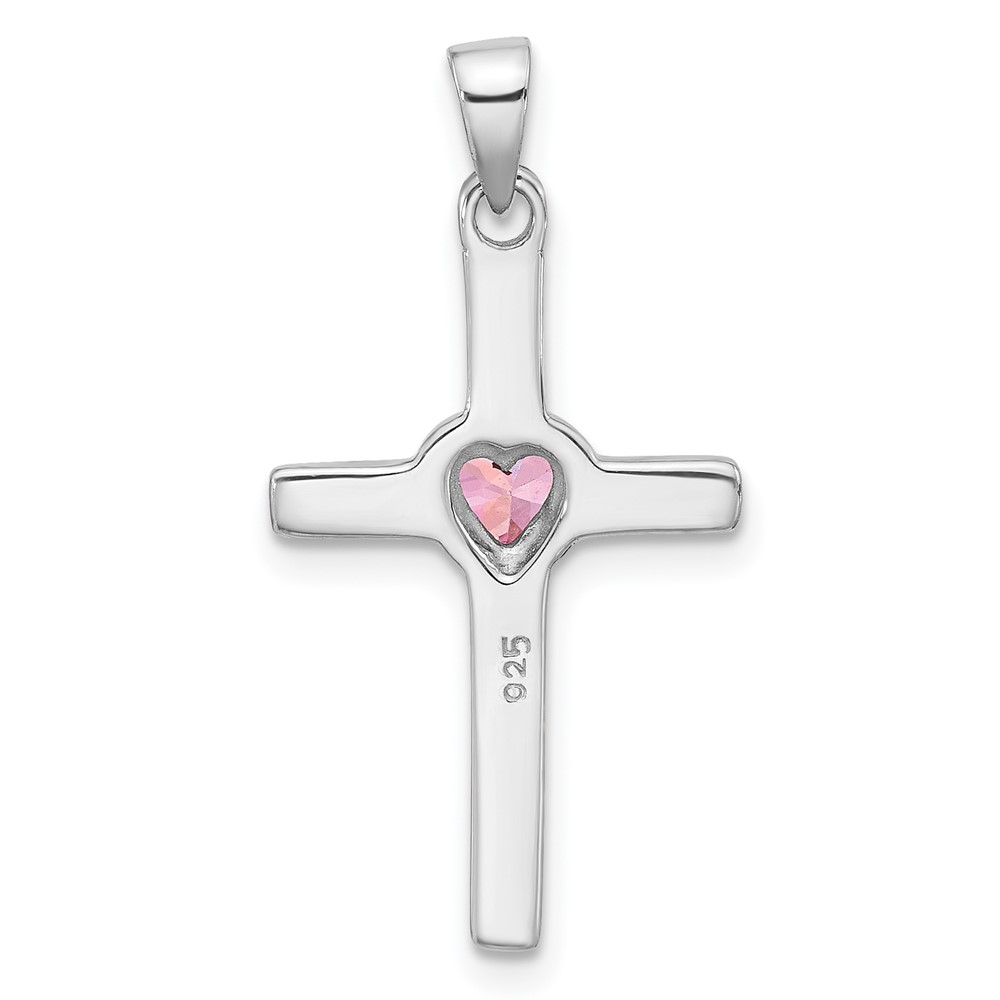 Sterling Silver Rhodium-plated Pink Heart CZ Cross Pendant