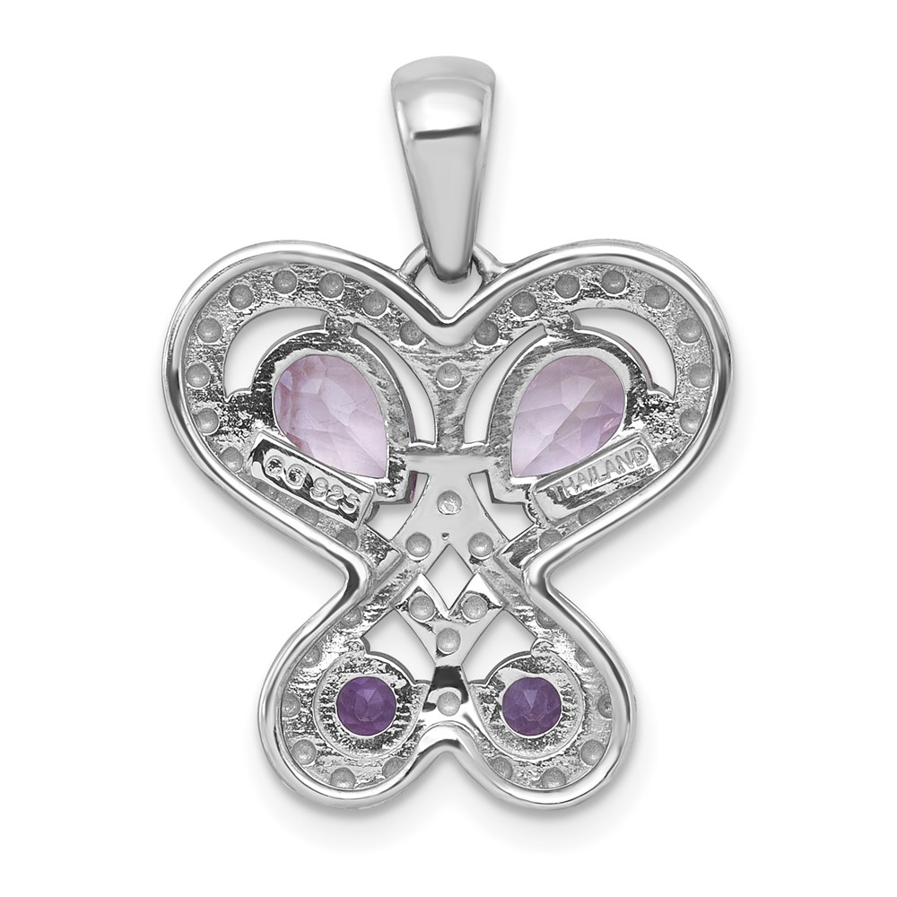 Sterling Silver Rhodium-plated Polished Amethyst and Rose de France Quartz Heart Butterfly Pendant