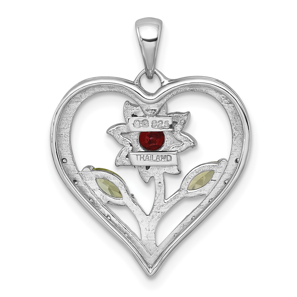 Sterling Silver Rhodium-plated Polished Garnet, Peridot and White Topaz Flower in Heart Pendant
