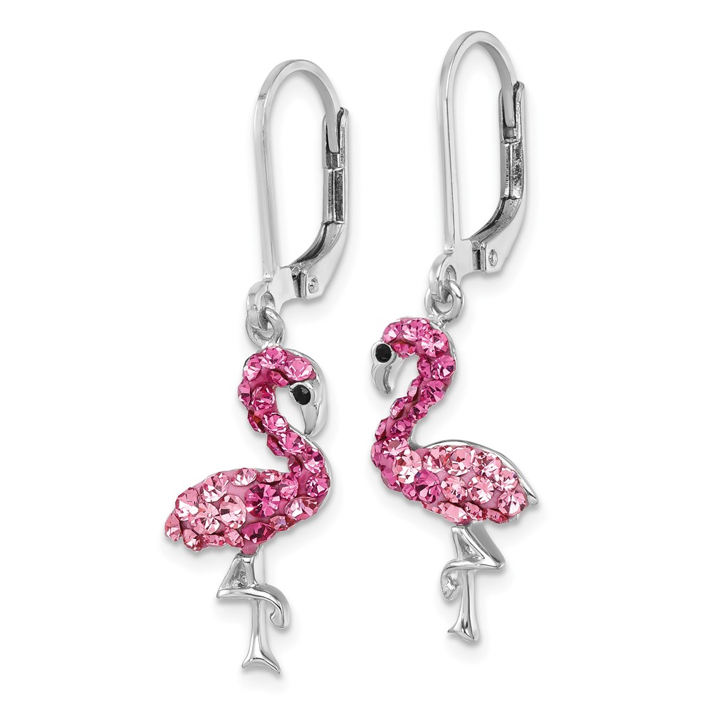 Sterling Silver Rhodium-plated Polished Pink Crystal Flamingo Leverback Earrings